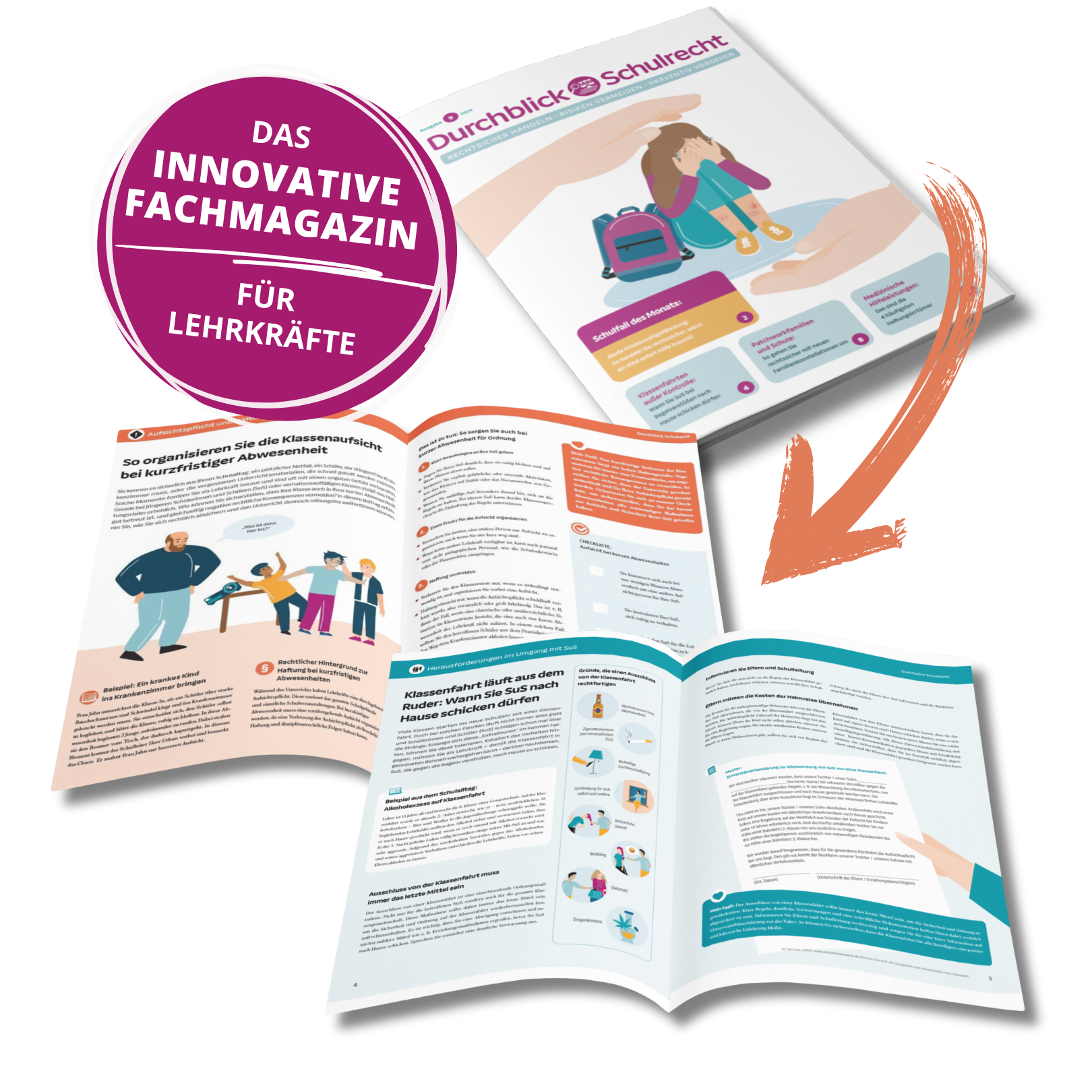 Mit „Durchblick Schulrecht“ bieten wir Ihnen als Lehrkraft erstmals ein Fachmagazin, das komplexe Schulrechtsfragen visuell auf den Punkt bringt: Anstatt langer Texte erwarten Sie ansprechende Infografiken, Schaubilder und klare Checklisten – so haben Sie die wichtigsten Schritte jederzeit im Blick und können sicher und souverän handeln.